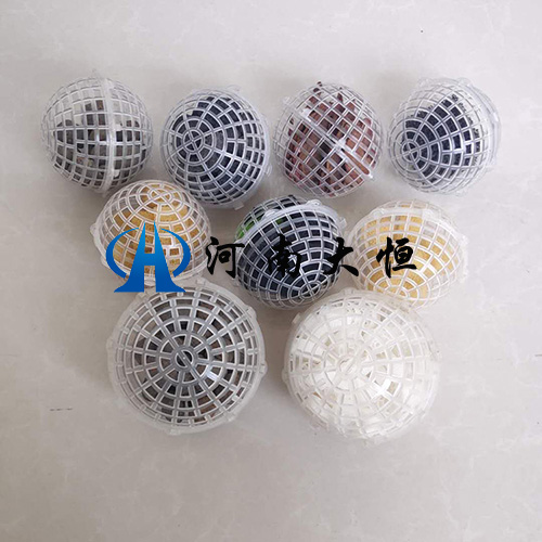如有特殊情況,可在前期通過掛網的形式在池內將懸浮球通過這個方法壓在下面,以此來解決懸浮球大量上浮的現象。懸浮球填料的規格有φ80/100/120/150mm幾種,根據規格不同,以及使用需求,可內置不同種類的填料,以助于污水處理掛膜效果的實現。